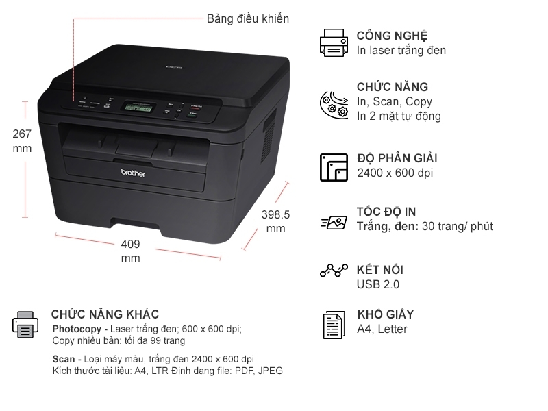 Máy in Brother DCP-L2520D có nhiều chức năng: In, Scan, Copy. Thiết kế và chức năng của máy in hoàn toàn phù hợp với các công ty có tầng suất in nhiều, và cũng phù hợp với những cá nhân làm việc tại nhà.